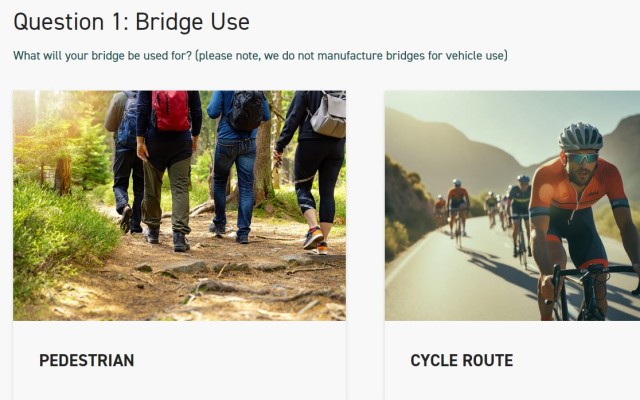 The Bison Bridges website now has a Specifier tool to help with your bridge enquiry. Simply select the options shown to confirm your requirements and access the correct pricing. Click the link below to make your enquiry.