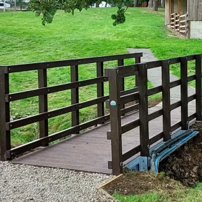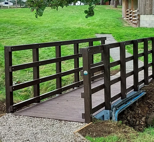 The installation team removed the existing structure, cast new concrete abutments and erected the recycled plastic 5 mtr Bison bridge structure. This project include a cable tray to carry the pipework crossing in the same location as the bridge.