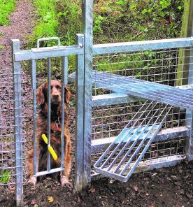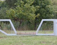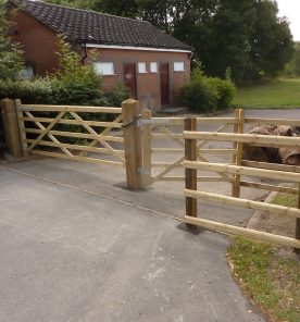 Heavy duty steel barrier gate with central step-over section, supplied complete with hanging and slamming post – slamming post incorporates a padlock secure box.